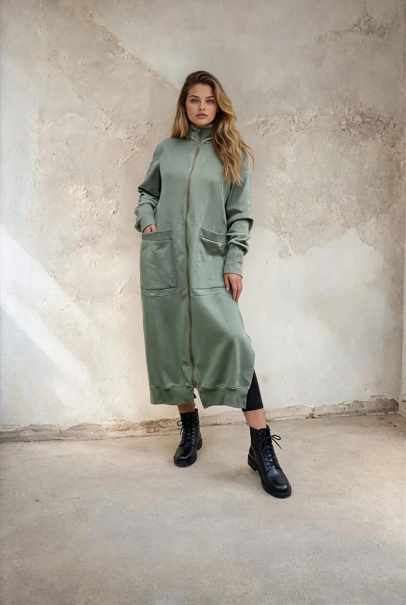 Bliuzono užtrauktukas atsisega tiek iš viršaus, tiek iš apačios, kas suteikia papildomo patogumo.